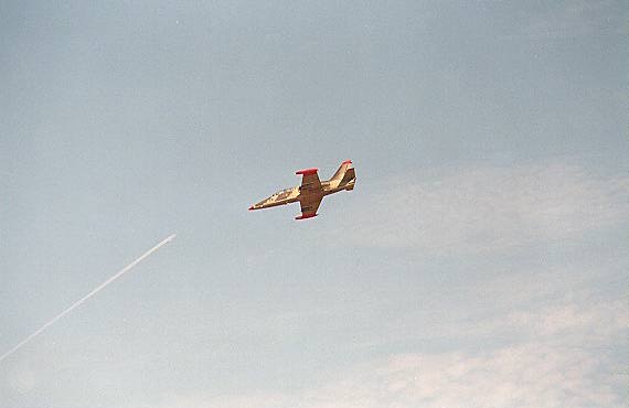 "James Bond" was driving a BMW, just like in the film. The airplane, a Czech-made L-39 Fenix, also known as Albatross, was the very same plane that was used during the making of Tomorrow Never Dies. This model was used as a trainer throughout the Warsaw pact, except in Poland. In addition, the L-39 is a favourite among jet pilots in the West with more than 50 privately owned L-39s in the world, most of them in the United States. You can get a used one yourself. Prices range from around $80000 to $900000 depending on age and equipment.